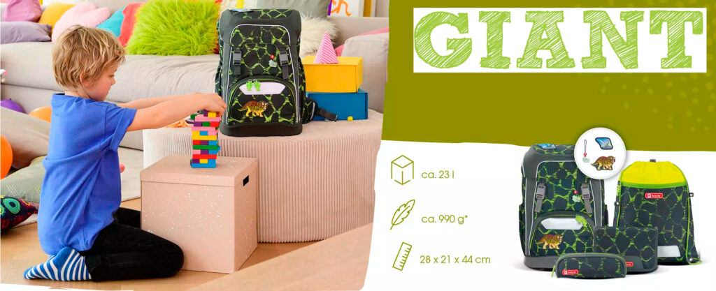 Der GIANT ist der große Schulrucksack von Step by Step. Er ist perfekt geeignet für alle größer gewachsenen Kinder. Dank der schlanken und hohen Form fasst er 23 Liter und ist somit der perfekte Begleiter von der 1. bis zur 4. Klasse. Dies wird durch das EASY GROW SYSTEM gewährleistet, durch welches der Schulrucksack höhenverstellbar wird und sich an die jeweilige Größe Deines Kindes anpassen lässt. Die wechselbaren Motive sorgen dafür, dass der Schulrucksack Deinem Kind über die gesamte Grundschulzeit hinweg gefällt.