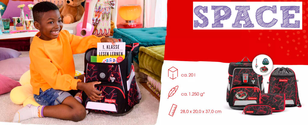 Der SPACE ist der geräumige Schulranzen von Step by Step. Er ist dank dem EASY GROW SYSTEM höhenverstellbar, wodurch eine perfekt Passform über mehrere Jahre gewährleistet wird. Durch die wechselbaren Motive kann der Schulranzen stets dem Traum-Motiv angepasst werden, so gefällt er Mädchen und Jungen von der 1. bis zur 4. Klasse.